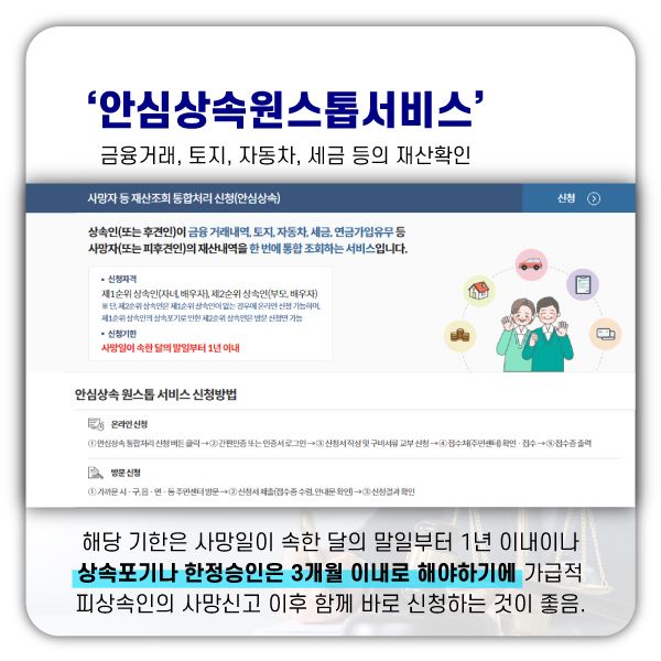 피상속인에 대한 사망신고를 한 이후에 기본증명서나 가족관계증명서 등에 피상속인의 사망사실이 등재가 되면 구청, 주민센터 등에 피상속인에 대한 『안심상속원스톱서비스』 를 통하여 상속재산의 규모를 대략적으로 파악할 수 있습니다.