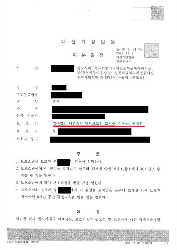 이동규변호사의 조력으로 소년은 1호, 2호, 5호 처분결정을 받았습니다. 이는 이 사건 소년에게 정말 정말 내려지기 어려운 가벼운 처분인데요.