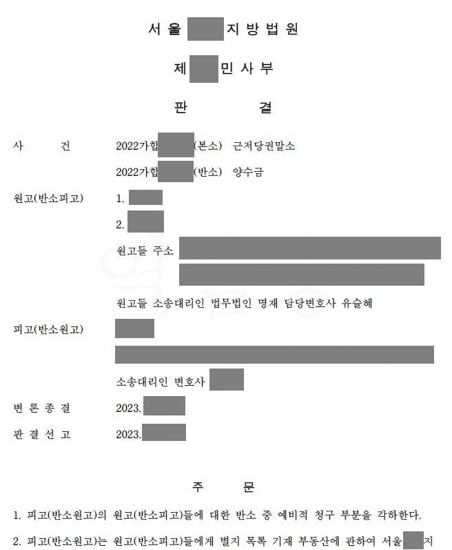 법원은 저의 이와 같은 주장을 받아들여서 이 사건 근저당권의 피담보채권은 처음부터 성립하지 아니하였거나 소멸시효의 완성으로 소멸하였고, 그에 따라 근저당권 역시 소멸하였으므로 피고에게 근저당권설정등기의 말소등기절차를 이행할 의무가 있다는 원고 승소 판결을 선고하였습니다. 이로써 의뢰인은 아파트에 설정된 근저당권을 말소시키고 가장 큰 재산인 아파트를 무사히 지킬 수 있었습니다.