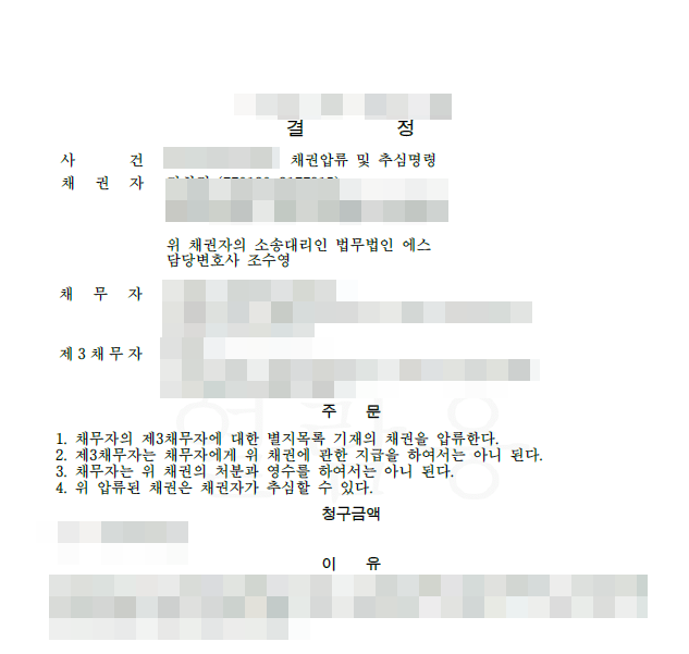 이에 저는 의뢰인을 대리하여 확정판결문을 집행권원으로 하여 상대의 집주인에 대한 임대차보증금 반환채권에 대한 압류 및 추심명령신청서를 제출하였습니다. 법원에서는 저희가 신청서를 접수한 후 1주일 후에 저희 측 신청이 이유가 있다고 보아 채권압류 및 추심명령 결정을 해주었습니다.