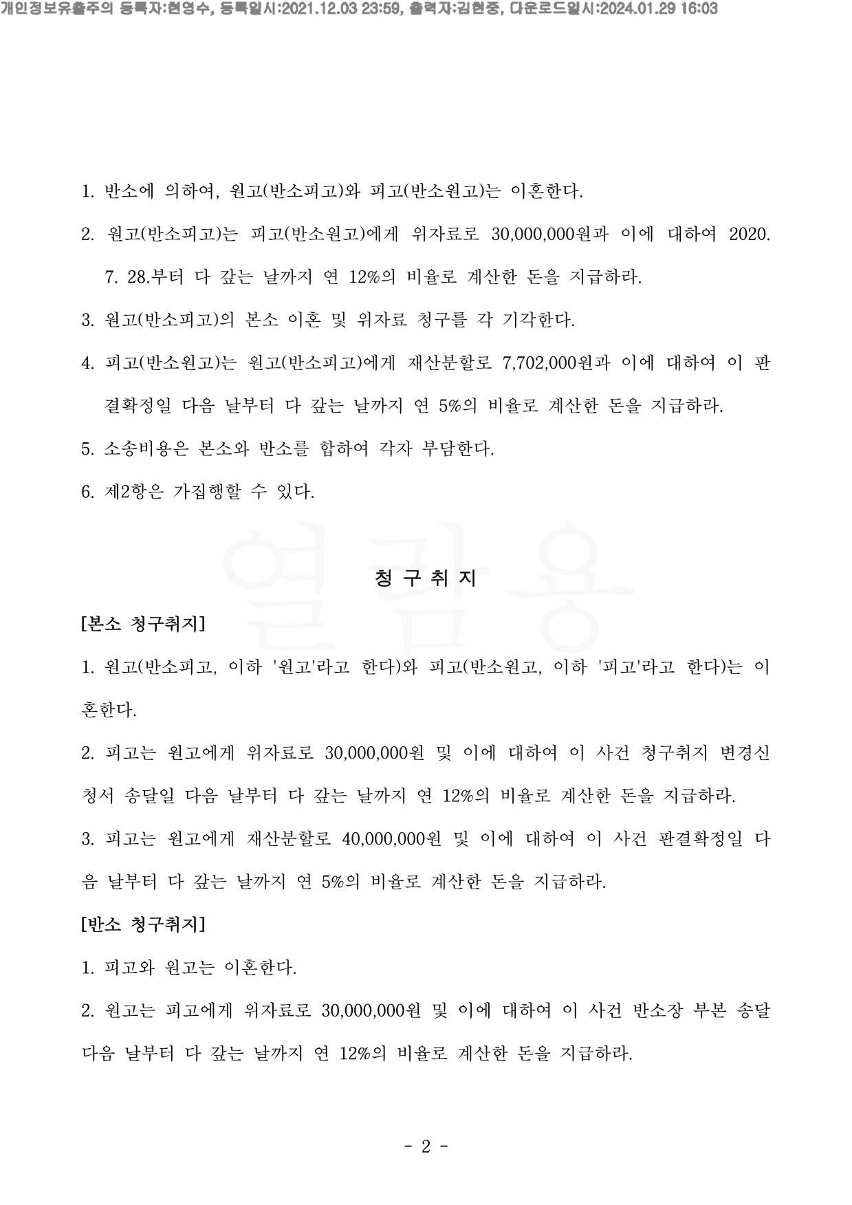 반대로 오히려 피고는 원고에게 3천만원의 위자료를 청구하여 전부승소 하였기에,