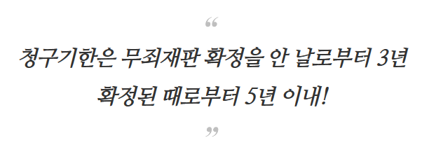 보상청구는 무죄재판이 확정된 사실을 안 날로부터 3년, 무죄 재판이 확정된 때부터 5년 이내에 진행하여야 합니다. 간혹, 시간이 늦어 보상청구를 못하시는 경우도 있기 때문에 기한을 놓치지 않도록 유의하시기 바랍니다.