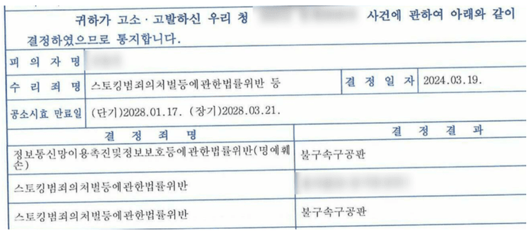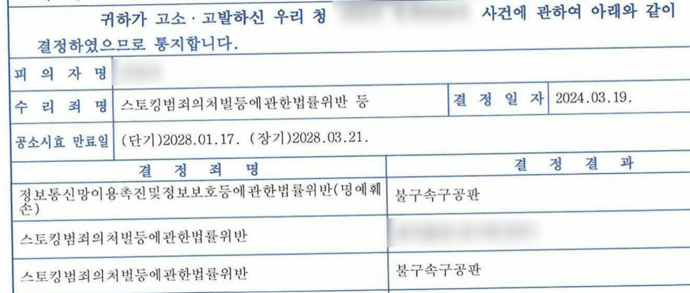 3. 최종 결과 - 전여친 스토킹, 명예훼손 고소 구공판