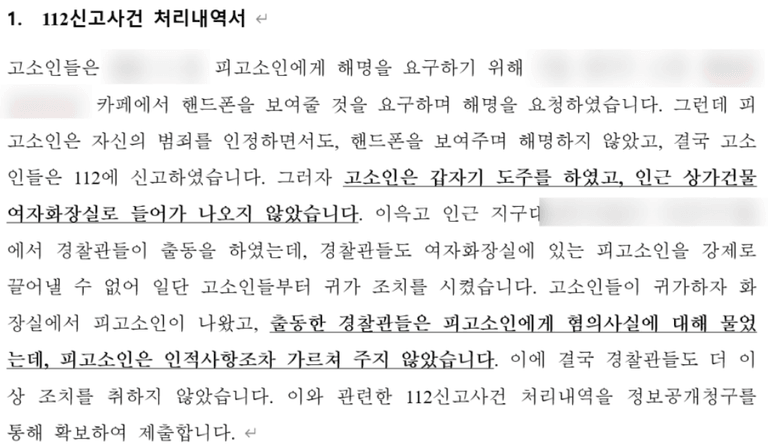 저희가 실제로 제출했던 서면의 일부. 112신고사건 처리내역서까지 발급받아 제출함.