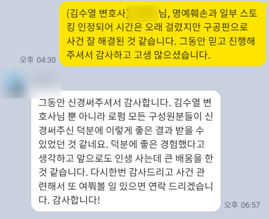 의뢰인분은 상대방의 가해행위로 주변 이미지도 실추되고 너무 무서웠는데 너무 잘 해결이 되어 기뻐하셨고, 혼자서는 이렇게 진행할 수 없었을 것 같다며 고마움을 표했습니다.