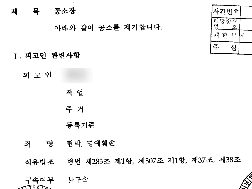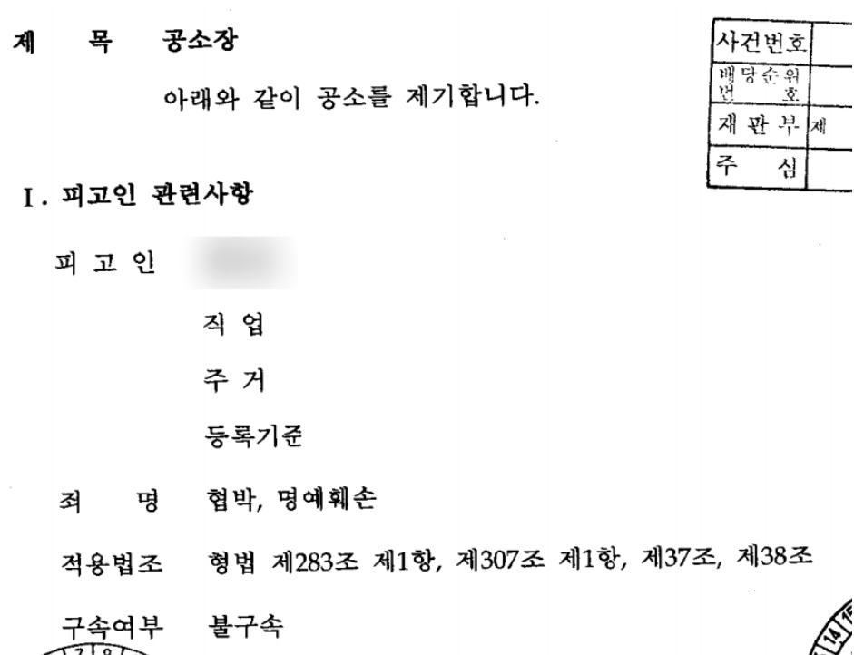 1. 사건의 개요 - 협박, 명예훼손 고소 정식기소