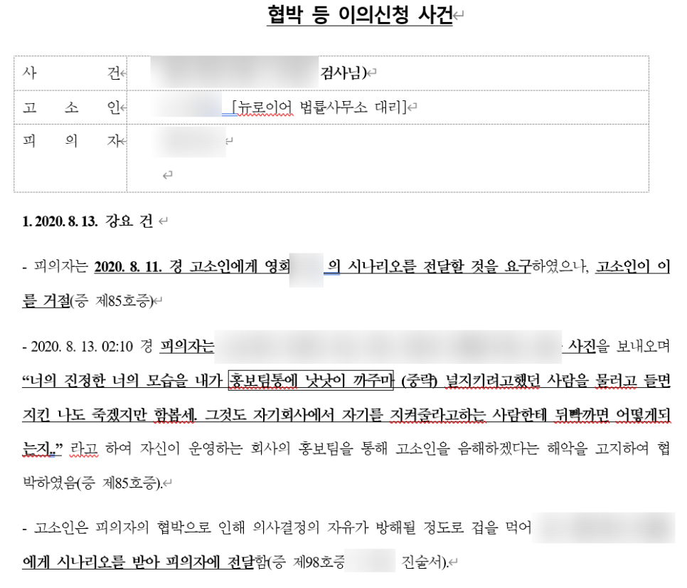 저희는 업무방해 등 안 될 것 같은 혐의는 제외하고 가능한 협박, 명예훼손 혐의에 집중하여 고소사실을 명확히 정리했고 이의신청서에서 왜 협박, 명예훼손에 해당하는지 핵심적인 법리와 적용을 위주로 명료하게 주장하였습니다. 그리고 정말 참고해야 하는 증거자료들만 선별하여 다시 제출하였습니다.