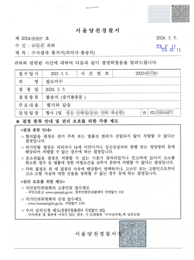 우선 만약 문이 열려서 피해가 발생한 사정을 가정하여 이 부분에 대해서는 반성과 사죄를 드리는 태도를 견지하면서, A씨의 경우 아무런 범죄 전력이 없는 초범이고, 범행을 실행하려 한 도구도 없으며, 동기 부분도 없다는 점을 강조했습니다. 수사기관은 이러한 사정을 감안하고, 다른 절도 범행에 착수했다는 객관적인 증거자료가 없음을 이유로 증거불충분으로 불송치 결정을 하고, 검찰에서도 경찰의 의견을 인정했습니다.