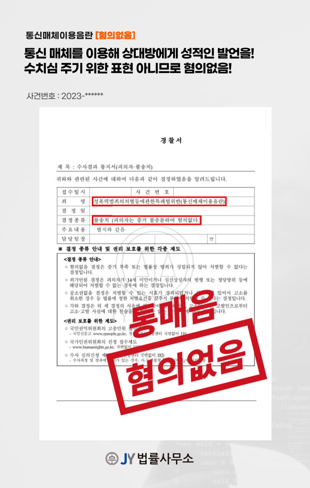 이러한 변호인의 노력에 따라, 의뢰인은 '혐의없음'을 처분받고 무사히 사건을 종결시킬 수 있었습니다.