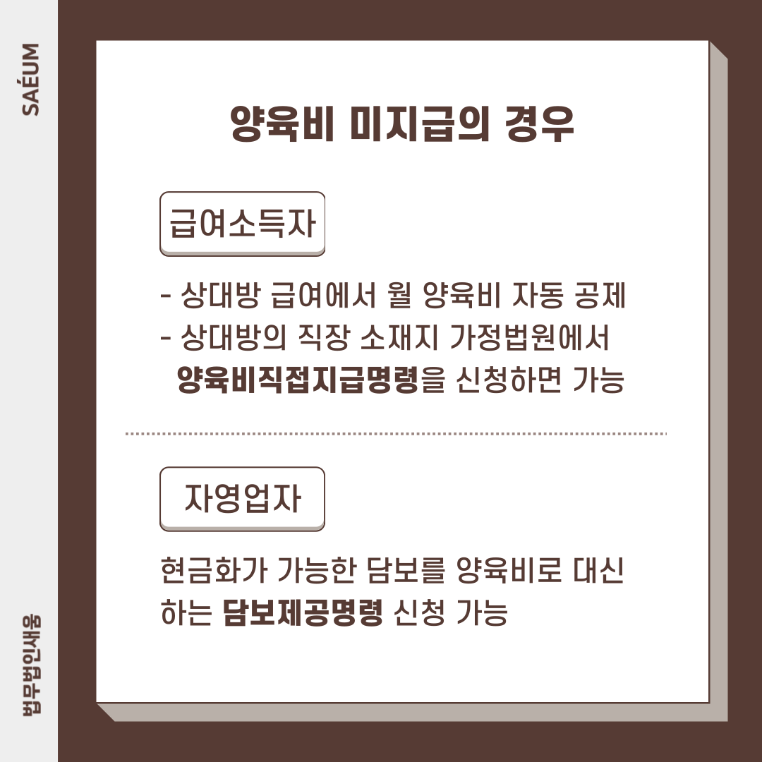 상대방이 급여 소득자인 경우에는 직장 소재지 가정법원에서 양육비직접지급명령을 신청해 급여로부터 월 양육비가 자동 공제되게끔 장치할 수 있습니다. 프리랜서나 자영업자일 때는 현금화 가능한 담보를 양육비로 대신하는 담보제공명령 신청이 가능합니다.