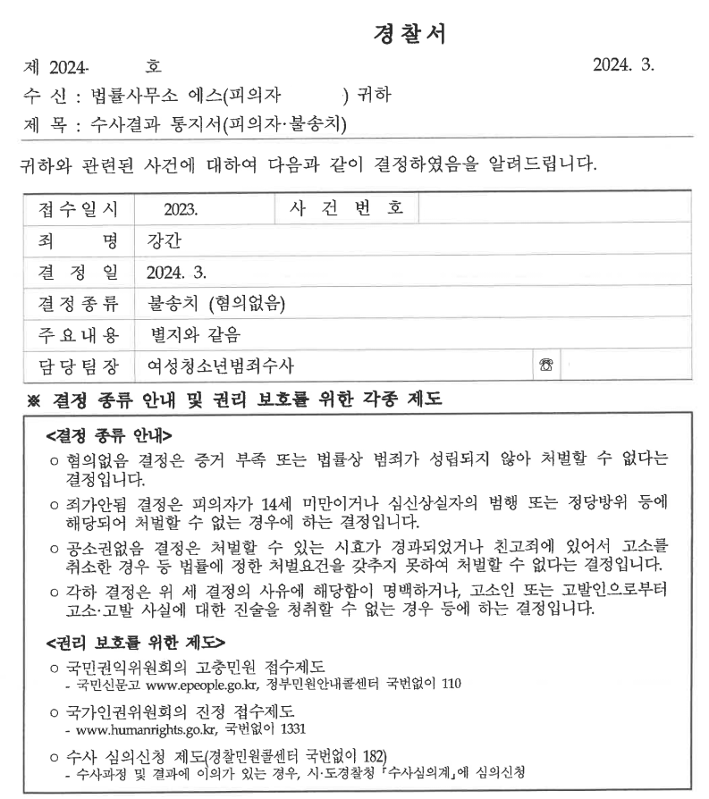 5. A씨는 강간 사건에서 저희의 조력을 받음으로써 경찰단계에서 불송치 처분을 받았습니다.