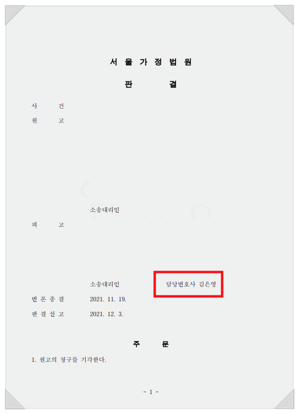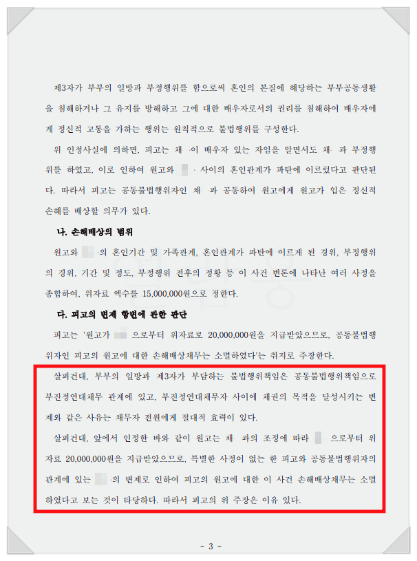 그러면서 원고는 이혼조정에서 A로부터 위자료 2천만원을 지급받기 때문에 의뢰인과 공동불법행위 관계에 있는 A의 변제로 의뢰인의 원고에 대한 손해배상채무는 전액 소멸하였다고 판단하고 원고의 위자료 청구를 기각하였습니다. 결과적으로 의뢰인의 변제항변이 받아들여진 성공사례입니다.