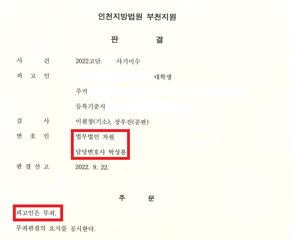 그러나 이 사건을 맡은 박성룡 변호사는 의뢰인이 당시 처한 상황이나 정황들을 잘 조합하고 재구성하여 피고인이 보이스피싱인 줄 모르고 한 일이라는 판결을 받아냈습니다. 무죄 선고
