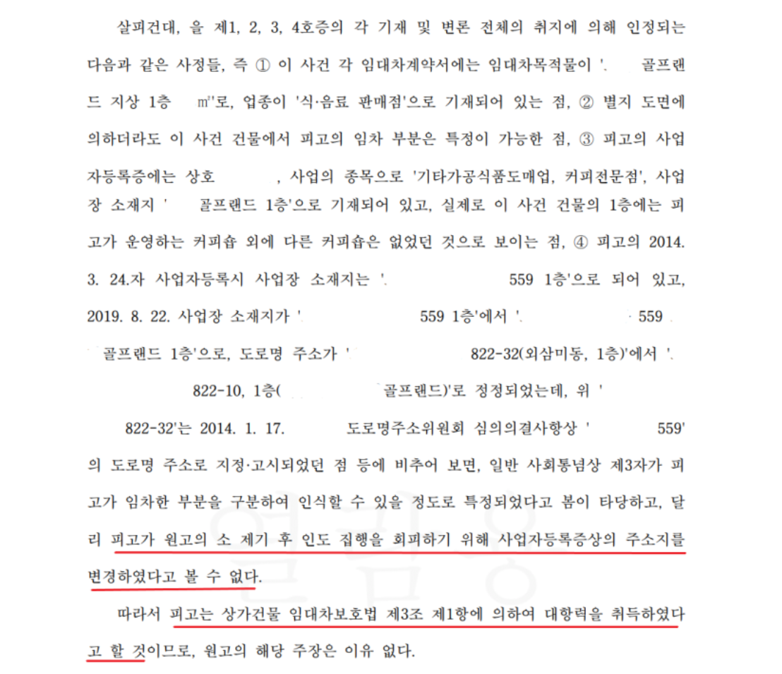 소송이 제기되자 의뢰인은 여러 변호사로부터 상담을 받았습니다. 이 과정에서 본인의 사업자등록에 문제가 있음을 알게 되었습니다. 의뢰인의 사업자등록증상 커피숍의 주소지는 "822-32"였습니다. 그런데 골프연습장의 실제 주소지는 "822-10"이었습니다. 주소지가 제대로 되어 있지 않았던 것이지요. 이렇게 되면 대항력을 인정받지 못하는 것이 원칙입니다.