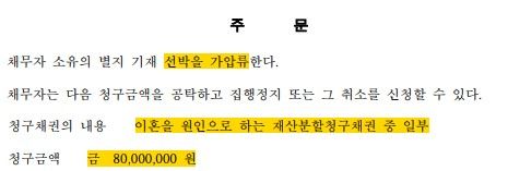 그 결과, 재판부는 의뢰인의 위자료 및 재산분할 채권 합계 1억 4천만 원을 모두 인정하였고, 부동산 뿐만 아니라 선박에 대한 가압류 결정도 모두 인용하였습니다. 그 덕분에 의뢰인은 이혼 소송 중 아내로부터 안전하게 선박 명의를 이전받는 방식으로 재산분할을 하여 원만하게 조정에 이를 수 있었습니다.