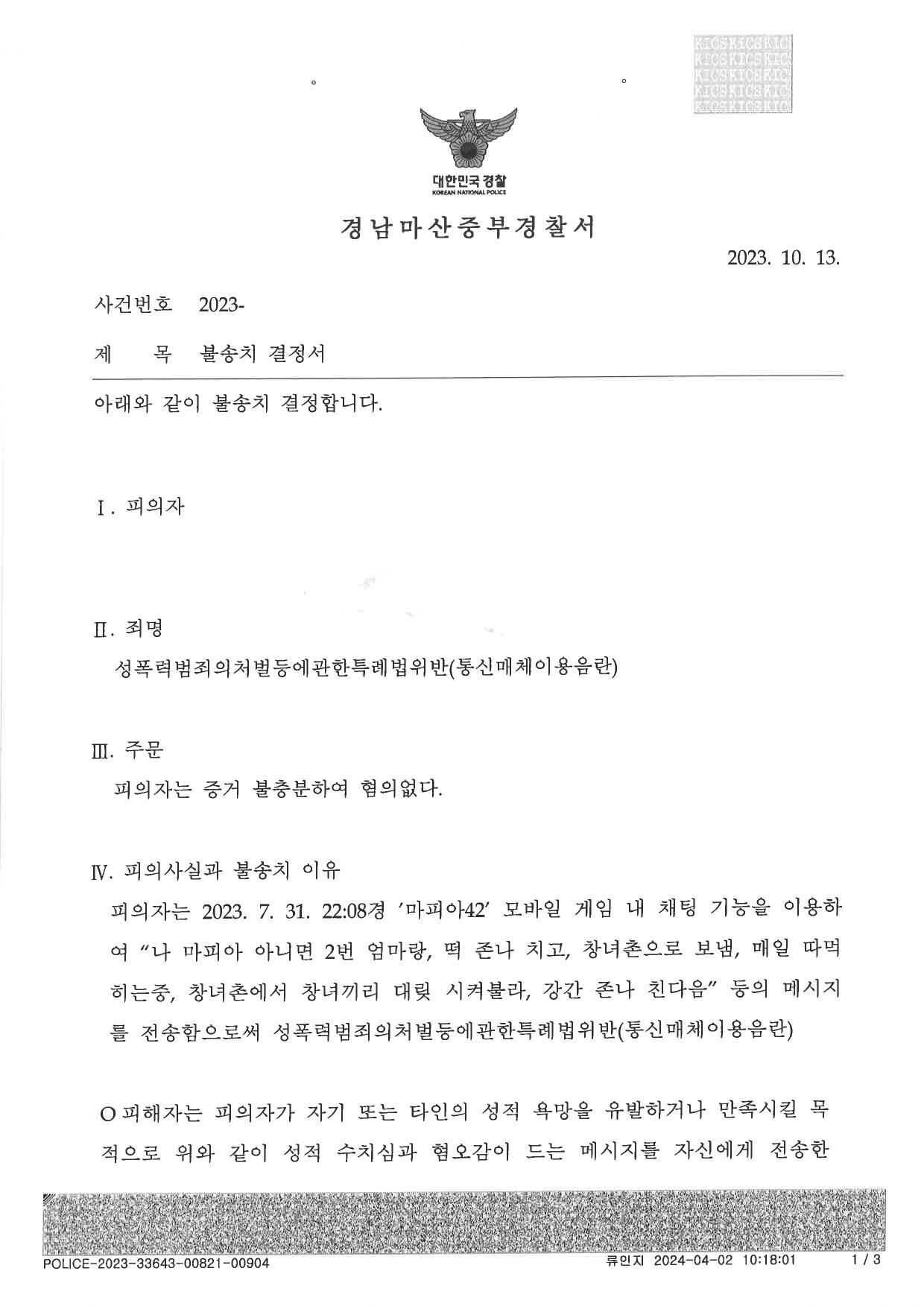피의자를 송치하려거든 피의자가 위 채팅을 보낸 일련의 사실관계가 왜 2018도9775판례의 전제사실관계와 유사한 것인 지 수사기관이 명확하게 설명을 하여 송치하려 달라고 요청 하면서,