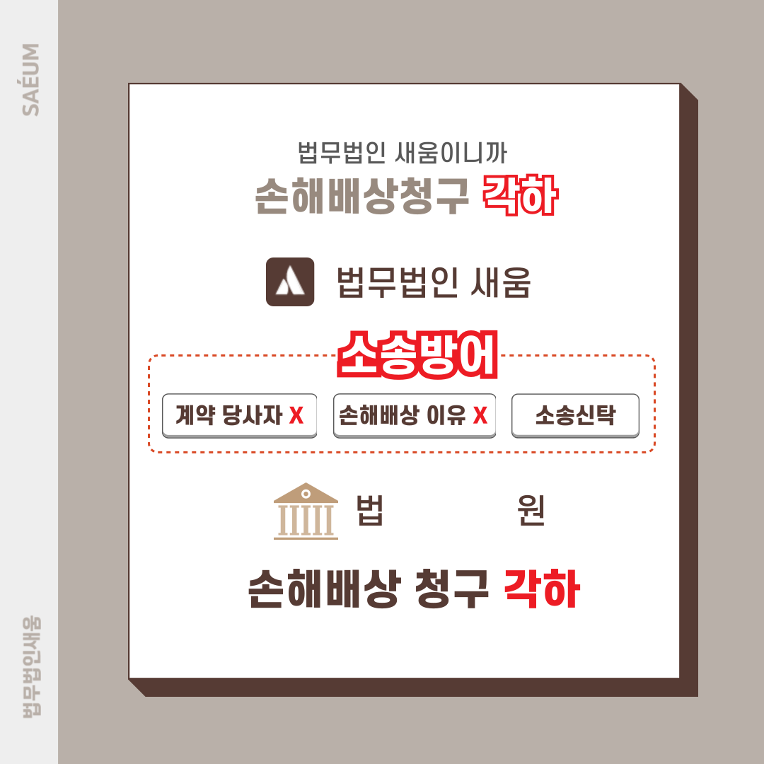 이에 법무법인 새움에서는 당사자는 B씨가 아닌 다른 사람이며, 기재된 내용이나 증인을 증언만으로는 B씨가 계약 당사자인 것을 입증할 수 없다고 방어하였습니다. 따라서 해당 사건의 계약자임을 전제로 한 손해배상의 경우 이유가 없는 청구라고 방어에 나서게 되었습니다. 또한 B씨는 해당 사건의 당사자가 아니기에 계약위반을 원인으로 한 손해배상을 할 수 없으며, 채권을 양수받은 것 또한 소송을 목적으로 한 소송신탁에 해당하여 무효라는 점을 강조하였습니다.