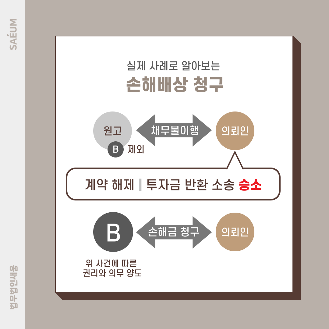 B씨는 이후 해당 사건은 의뢰인과 다른 원고들이 체결한 것처럼 기재가 되어 있지만 실질적으로는 B씨와 체결되어 있는데, 의뢰인이 해당 사건의 계약을 위반해서 투자금 일부를 반환하지 않았고 그로 인해서 결국 경영권을 빼앗겨 합의가 해제된 것인데도 채무불이행을 사유로 하여 투자금의 손해를 B씨에게 전가함으로 인해서 B씨는 해당 사건 전소의 판결원리금을 변제공탁 등의 피해를 보았다고 주장합니다. 이에 의뢰인은 B씨에게 변제공탁금 중에서 일부 청구하는 2억에 대한 지연손해금을 지급하라는 청구를 하였습니다.
