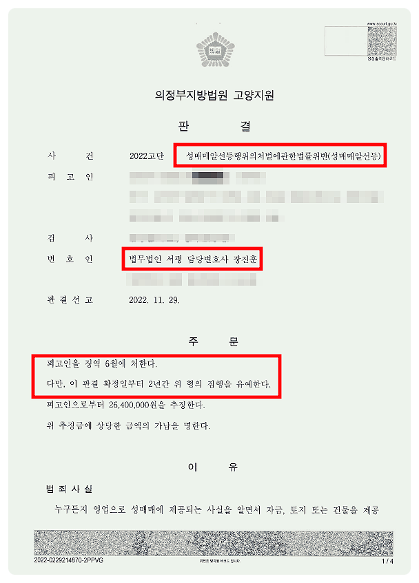 그 결과 법원은 징역 6월에 집행유예 2년, 임대료 상당의 2,640만원 추징을 선고하였습니다. 성매매업소로 이용될 수 있도록 각 건물을 임대하였기 때문에 실형을 선고받을 수도 있는 사안이었지만, 변호사의 조력으로 법정구속을 피하고 집행유예를 받은 성공사례입니다.