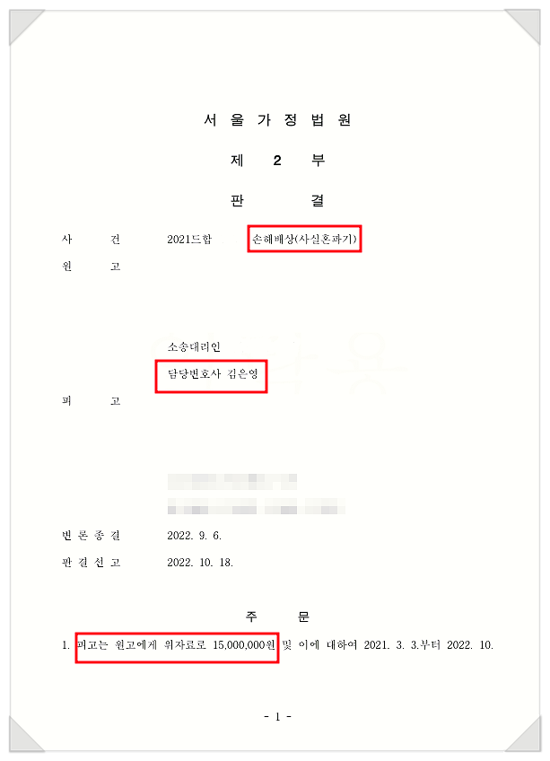 위자료는 남편에게 사실혼관계 파탄의 책임이 인정된다며 1,500만원을 인정하였습니다.