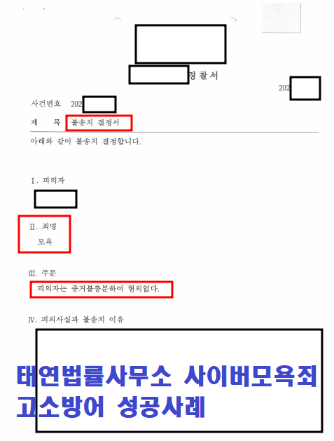 의뢰인과 상담을 진행하신 대표변호사님께서는 해당 댓글 내용의 욕설 수위가 매우 높다고 판단되는 사안이었지만 유사한 사례에서도 치밀하고 날카로운 수사 전략으로 불송치 결정을 이끌어낸 사례가 워낙 많기에 대응이 가능하다는 답변을 드릴 수 있었습니다. 상담 후 명쾌한 답변과 경험에서 우러나오는 노하우에 태연법률사무소를 깊게 신뢰하신 의뢰인은 사건을 위임해주셨습니다. 담당변호사님께서는 즉시 사건에 착수하셨고 경찰 단계에서 불송치 결정을 받는 것을 목표로 고소를 대응하기로 하셨습니다. 의뢰인의 사건을 신속히 해결해드리기 위해 수차례 전략 회의를 거듭하며 사건이 유리한 방향으로 진행될 수 있도록 철저한 수사 전략을 구상하셨습니다. 무엇보다 의뢰인의 혐의가 입증되지 않도록 수사기관을 설득할 만한 정확한 논리와 사실관계를 기반으로 변호인의견서를 작성하여 수사기관에 제출하셨습니다. 태연법률사무소의 치밀한 수사 전략을 바탕으로 담당변호사님과 함께 경찰 조사에 든든하게 동행하셨고 의뢰인 역시 전략대로 경찰 조사를 수월히 진행할 수 있었습니다. 경찰 조사 이후 의뢰인은 혐의 없음을 인정받아 불송치 결정을 받았다는 내용의 수사결과 통지서를 수령하여 성공적으로 사건을 마무리할 수 있었습니다!