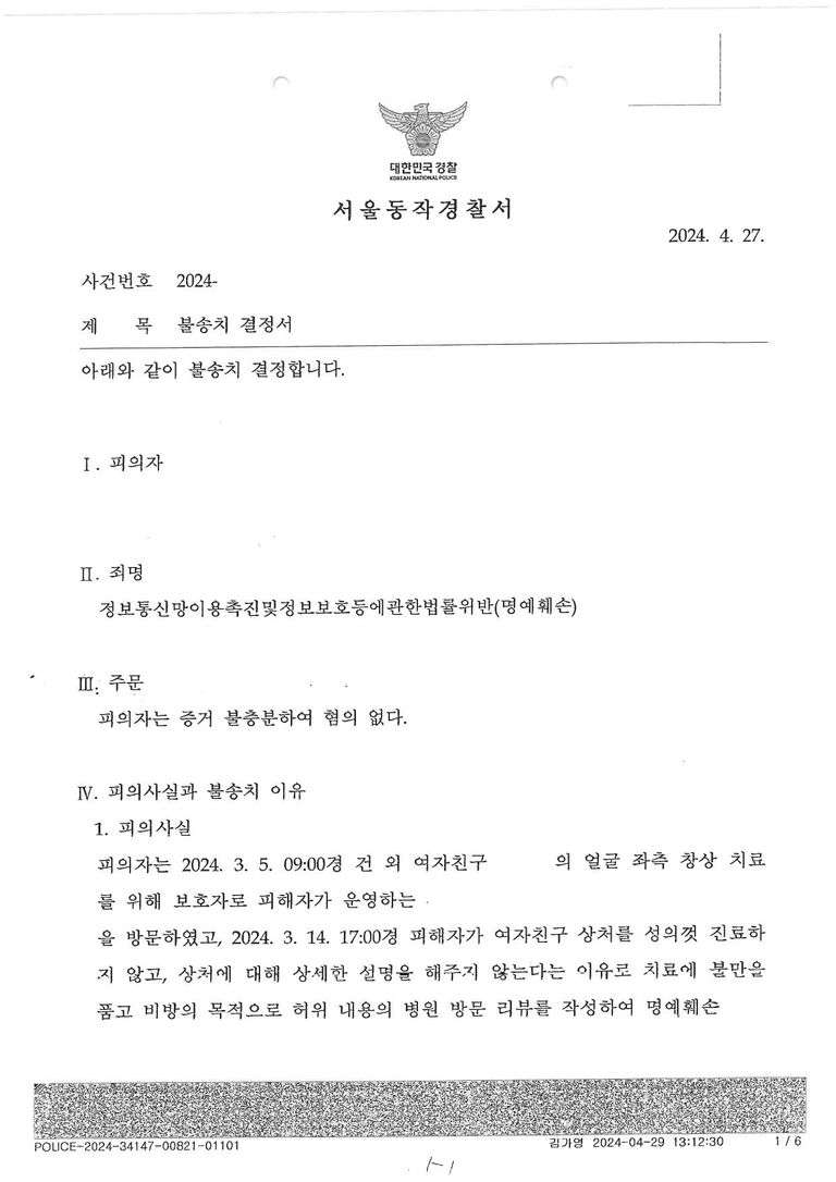 이후 피의자는 병원의 진료에 대해 불만을 가지게 되었고, 다음 날 다른 병원을 방문하여 치료를 받은 후에 처음 진료를 받았던 병원에 대한 비난의 리뷰를 공개적으로 작성 하였고,
