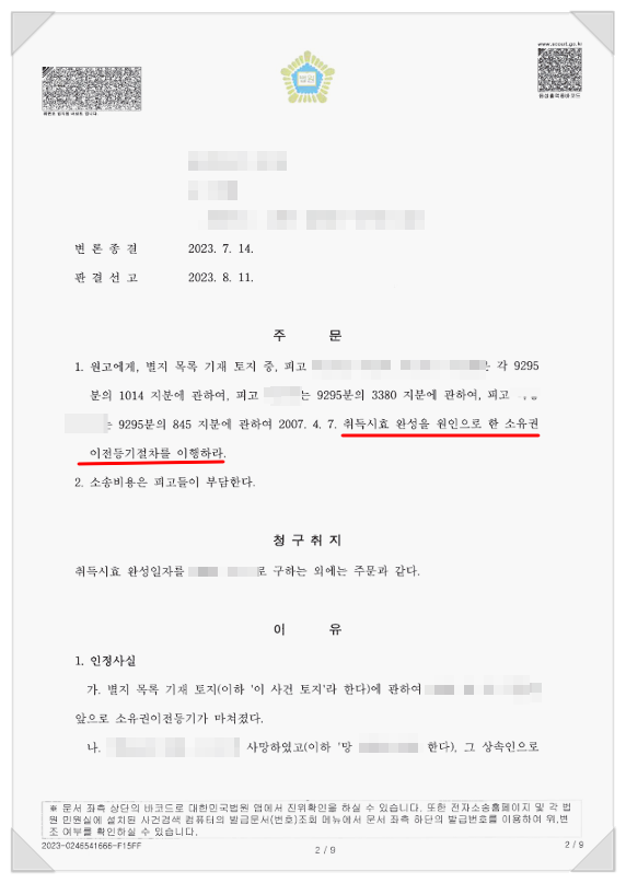 그 결과 법원은 원고의 자주점유를 인정하며 잔금지급 시기인 2007.4.7. 무렵 점유취득시효가 완성되었다고 보았습니다. 따라서 피고들은 원고에게 토지의 각 상속지분에 관한 소유권이전등기를 이행하라고 판결하여 원고의 점유취득시효완성을 인정한 성공사례입니다.
