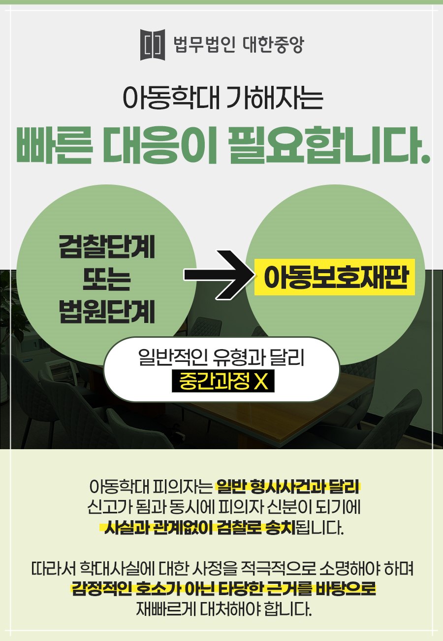 이러한 위기에 놓여 있다면 어떻게 해야할지 막막할 수 있으니 전문 변호사의 다양한 조력을 받는 것이 필요로 할 것인데, 법무법인 대한중앙 아동학대변호사는 사실관계를 빠르게 파악하고 상황에 따른 구체적 대처방안을 세우며, 경찰조사에 동행하여 잘못된 진술을 바로잡고 오해의 소지를 없애고 법적 대응을 도울 것입니다.