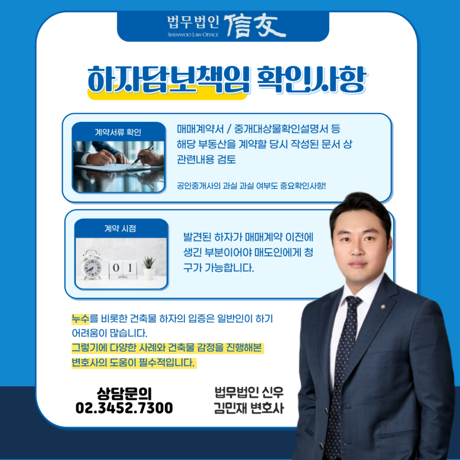아파트나 빌라를 매입해서 이사를 갔는데 결정을 내리기 전에는 알지 못했던 하자를 발견했다면 누구나 당혹스러울 수밖에 없습니다. 이러한 문제는 부동산 취득 과정에서 생각보다 흔하게 발생하는 분쟁 사례 중 하나입니다. 이러한 갈등 상황에 처했다면 싸움을 회피하기 위해 자부담으로 수리를 해야 할지, 누수전문변호사를 선임해 법적 대응에 나서야 할지를 두고 고민하게 됩니다. 구체적인 해결 과정과 반드시 알아두어야 할 내용을 정리해드리겠습니다.