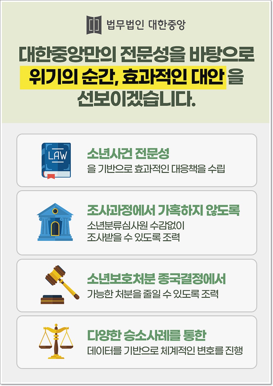 그러므로 법무법인 대한중앙은 자녀에게 유리한 정황이 될 수 있는 다양한 증거 수집 가운데 도움을 드릴 것이며 범죄 혐의를 부인하기 어려운 상황이라면 선처를 받을 수 있도록 전략을 세우는데에 힘을 드릴 것입니다. 또한 해당 사안의 경우 대응할 수 있는 시간이 그리 많지 않으므로 서둘러 나아가실것을 권유드리는 바 입니다.