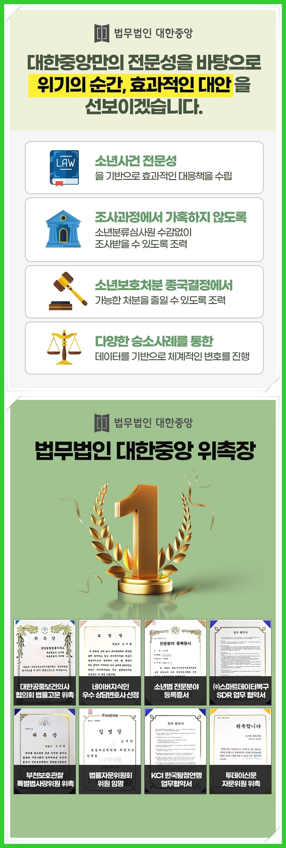 심각한 사건이라 할지라도 풀어가는 방법에 따라 최소한의 처분으로 아이의 미래에 영향을 줄 부분을 최소화 할 수 있도록 저희 법무법인 대한중앙이 아이의 미래와 부모님들의 걱정을 덜어드리기 위해 함께 하겠습니다.