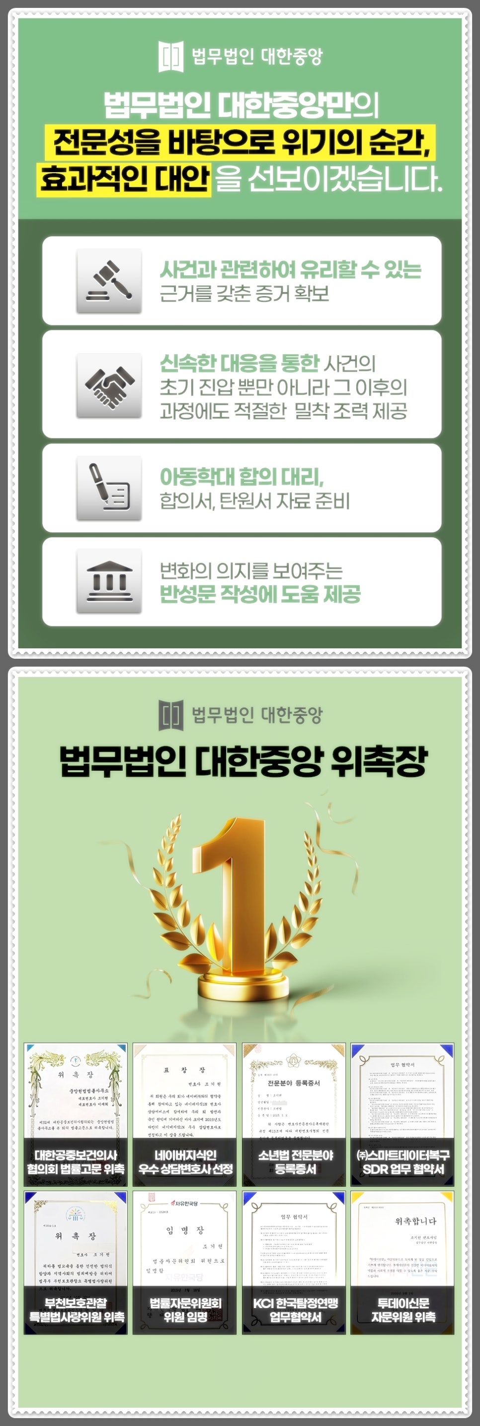특히 검사의 판단이 잘 못되어 기소유예 불복을 하게 되었으므로 인해 이를 인정 받을 수 있도록 형사법에 정통한 변호사와 진행 하시는 것이 안전한데요, 저희 법무법인 대한중앙은 헌법소원 전문가로 구성된 변호사가 원하시는 결과를 위해 최선을 다해 모든 절차를 진행해 드리고 있으므로 기소유예 불복을 원하신다면 법무법인 대한중앙으로 상담 문의 주시기 바랍니다.