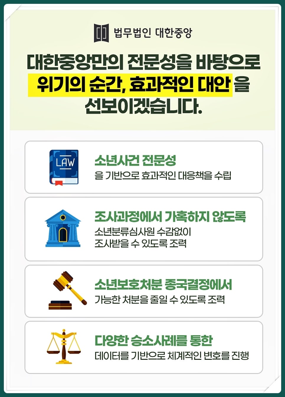 아이가 이러한 상황에 휘말렸다면 보다 냉정하고 정확한 상황 판단으로 제대로 된 대처를 하시기 위해 반드시 실력을 갖추고 아이의 미래를 진심으로 생각하는 법무법인 대한중앙으로 문의 주시기 바랍니다