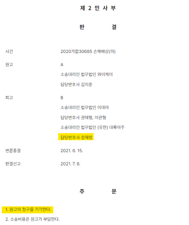 본 변호사는 피고를 대리하면서, 비록 피고가 스테로이드 약제를 대면진료 하지 않고 택배로 보내주기는 하였으나 원고가 처음 내국하여 약제처방을 받을 당시에는 대면진료를 하였다는 점, 피고는 원고가 요구하는 기간에 따라 약제를 처방하였을 뿐이고 1일 당 투약분은 적정 수준이었다는 점, 원고는 해당 기간 동안 피고 외에 여러 약국에서 유사한 약제를 동시에 처방 받아온 점, 원고가 주장하는 피해사실의 원인은 "특발성(원인미상)"인 경우가 다수인 점 등을 집중적으로 주장하며, 인과관계 배척에 집중하였습니다. 그 결과 1심 법원은 피고 주장의 합리성을 인정하며 원고의 청구를 모두 기각하였습니다.