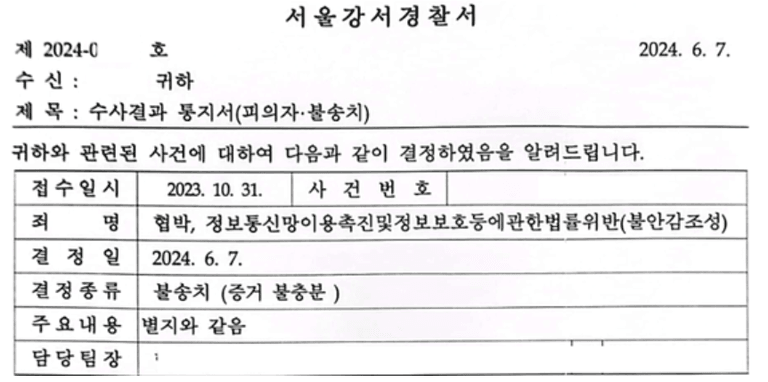 3. 최종 결과 - 협박, 불안감조성 무혐의 불송치