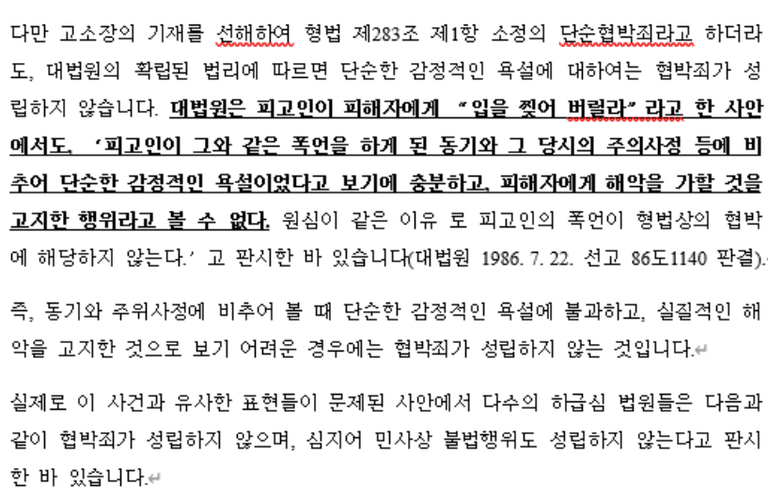 협박, 불안감조성 등의 죄목으로 고소되는 경우, 형사과에서 수사가 진행되는 경우가 많은데, 이를 변호하기 위해서는 협박, 불안감조성의 죄목이 법리적으로 성립하지 않는다는 점을 더욱 정치하게 주장할 필요가 있습니다.