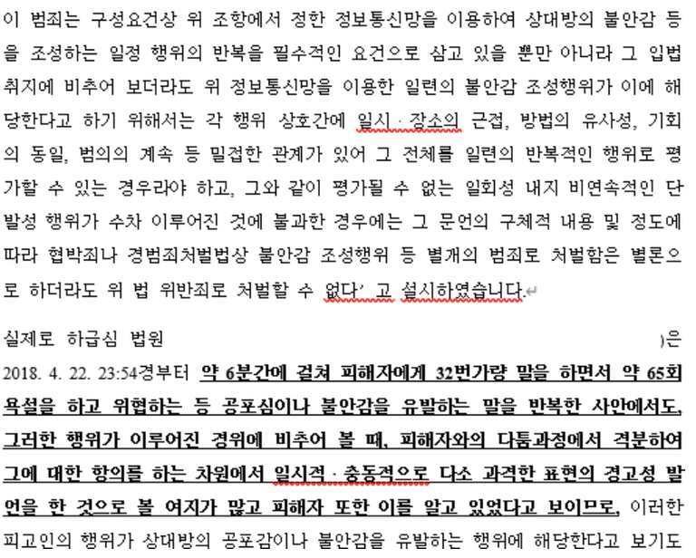 또한 정보통신망법 위반(불안감조성)은 저희 뉴로이어 법률사무소의 홈페이지에도 확인하실 수 있듯이 협박(공포심)의 수위에는 이르지 않지만 불안감을 조성할 수 있는 문언을 정보통신망을 이용하여 반복적으로 상대방에게 도달케 하는 경우에 성립할 수 있는 죄목인데요.