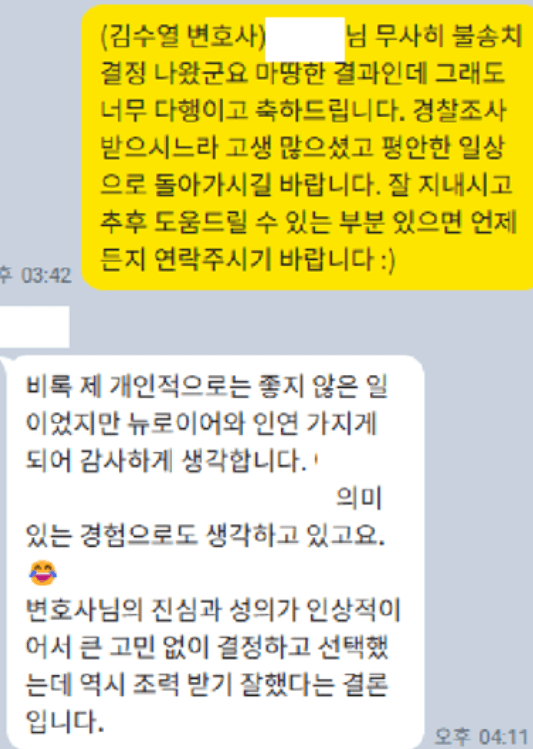 조사 전에 저희는 수 차례 시뮬레이션을 하며 의뢰인분꼐서 말씀을 잘 하실 수 있도록 도와드렸고, 그 결과 조사를 마친 이후 바로 의뢰인분께서는 불송치통지서를 받아보실 수 있었습니다.