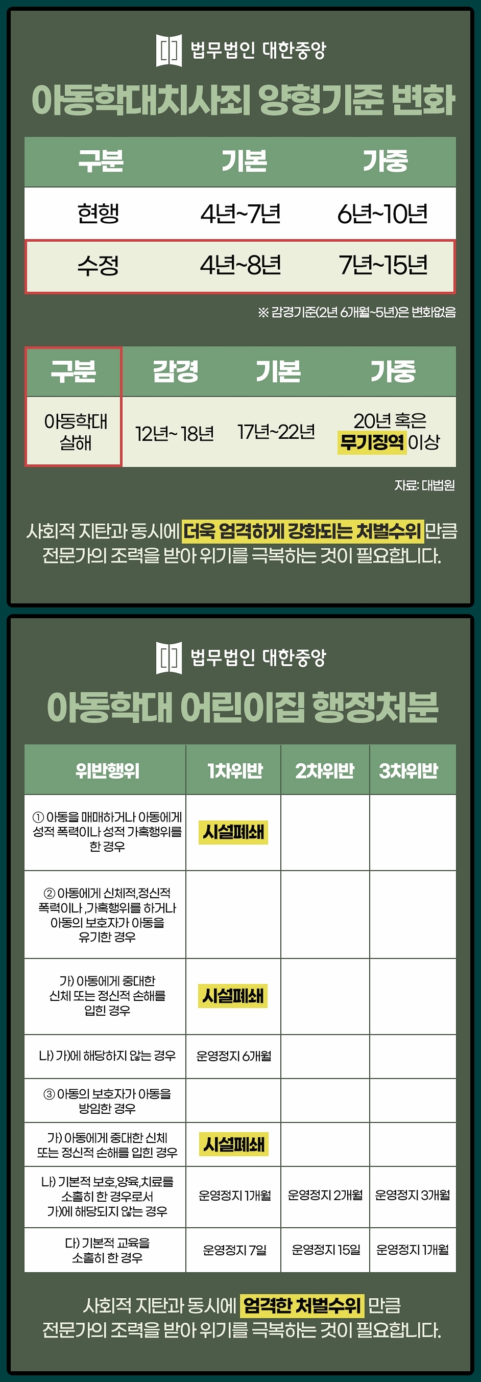심각한 아동학대로 인해 소중한 어린 생명에 까지 위협을 주는 사태가 발생하고 이러한 사건이 매스컴을 통해 보도 되면서, 아동학대는 사회적으로도 큰 물의를 일으키게 되는 범죄가 되었습니다.