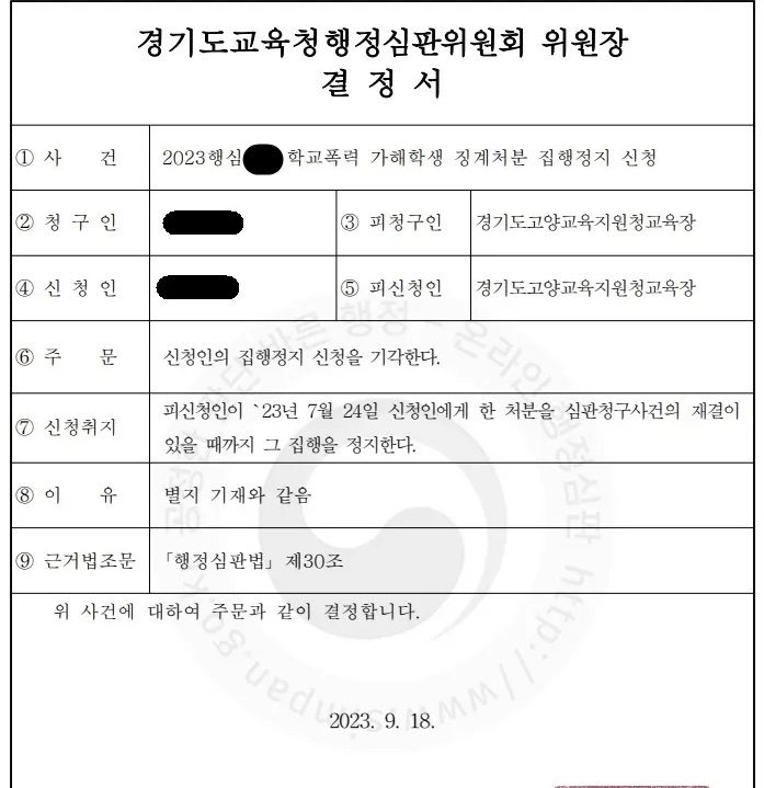 신청인 OOO은 OOO중학교 1학년에 재학 중인 학생으로 피해학생에게 학교폭력을 가한 사실이 인정되어, 피신청인인 경기도고양교육지원청장으로부터 2023.7월 ‘접촉, 협박 및 보복행위금지, 사회봉사 3시간, 학생 특별교육 5시간, 보호자 특별교육 5시간’ 처분(이하 ‘이 사건 처분’이라 한다)을 받아, 이 사건 처분에 대한 취소를 구하는 심판청구와 함께 재결이 있을 때까지 해당 처분의 집행을 정지하고자 하는 취지의 신청을 하였다.