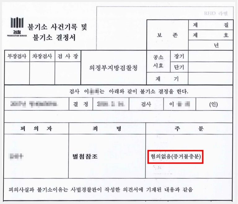 수사기관에서는 이와 같은 변호인의 주장을 바탕으로 철저한 수사를 진행하여 의뢰인에게 적용된 모든 혐의에 대하여 '혐의없음'의 처분을 하였습니다.