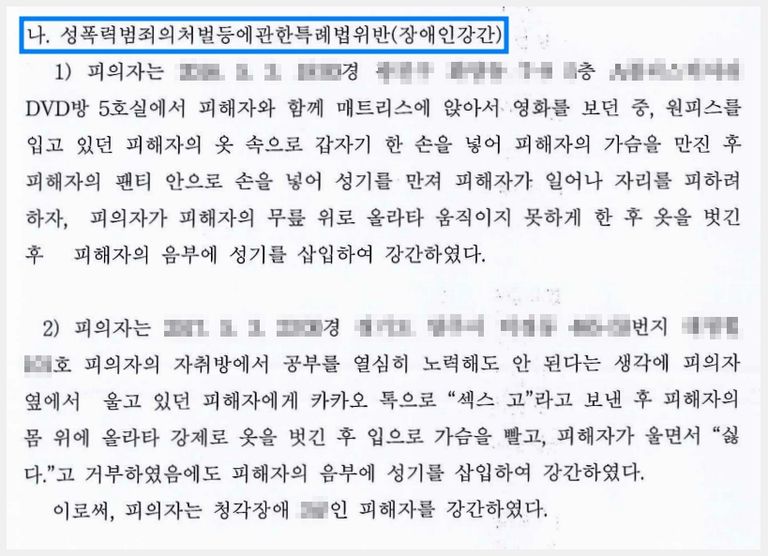 그런데 고소인인 의뢰인의 전 여자친구는 정도가 심하지는 않으나 귀가 잘 들리지 않는 청각장애를 가지고 있었기 때문에 의뢰인에게는 성폭력범죄의 처벌 등에 관한 특례법에 정한 카메라등이용촬영 외에도 장애인강제추행, 장애인강간 혐의가 적용되었습니다.