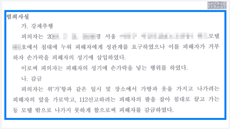 그러나 경찰은 변호인의 합리적인 주장을 일부만 받아들이고 대부분 배척하여 의뢰인을 (유사강간이 아닌) 강제추행과 감금 혐의로 검찰에 송치하였습니다.