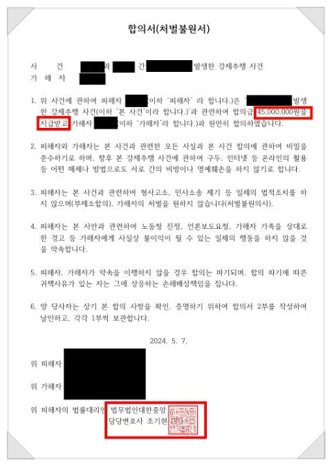 안심한 A씨는 합의를 의뢰하였고 법무법인대한중앙이 조기현 변호사가 협상을 진행했습니다. 법무법인대한중앙 변호사는 증거자료, 유사판례 등을 검토한 뒤 적정한 합의금 액수를 대략 4,500만원으로 책정했습니다.