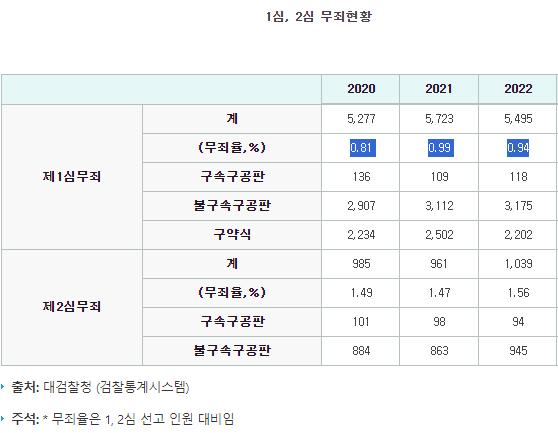 대검찰청 통계에 따르면 1심 무죄율은 1%도 되지 않습니다.