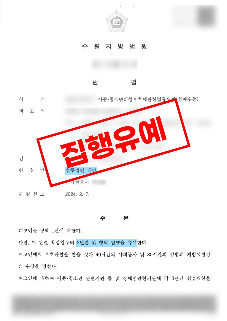 재판부는 담당변호인의 의견을 받아들여 징역형의 법정형(1년 이상 10년 이하)의 하한인 징역 1년에 집행유예 2년을 선고하였습니다.