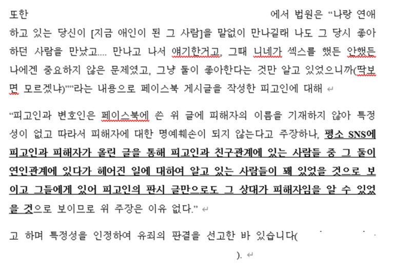특히 해당 게시글이 피해자의 실명이나 닉네임을 담지 않고 있는 경우에, 이른바 ‘특정성’이 성립하지 않는다고 판단될까봐, 피해자분들께서는 고소 자체를 고민하시는 경우도 많습니다.