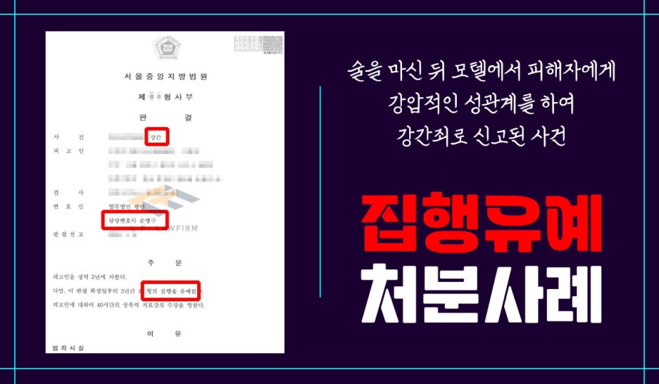 그래서 의뢰인의 변호를 맡아 피해자를 잘 설득하여 피해자와의 합의를 이끌어 내었고, 이에 더하여 재범을 일으키지 않을 것이라는 노력과 추가적으로 의뢰인의 정상관계 자료를 받아 변호인의견서를 법원에 제출하며 최대한의 선처를 구하는 등의 적극적인 조력을 하였습니다. 그렇게 하여 강간죄에 대해 집행유예를 받을 수 있게 되었습니다.