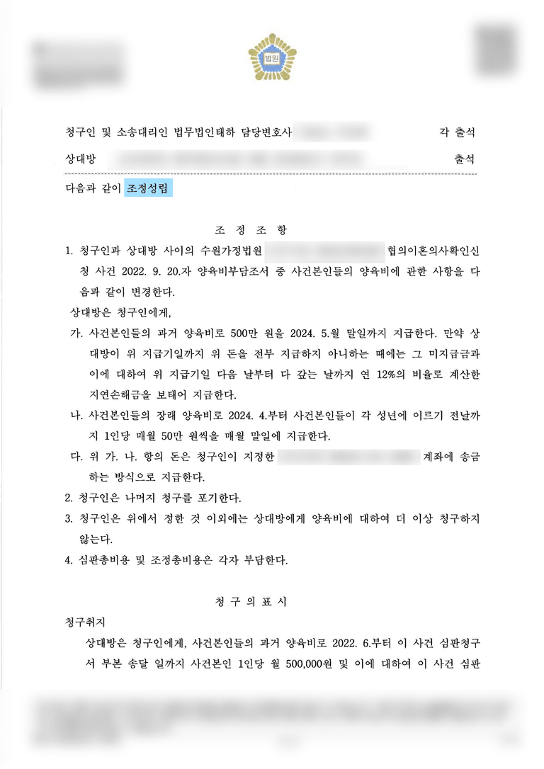 조정 성립(과거 양육비 500만원, 장래 양육비 사건본인 1인당 50만원 지급)