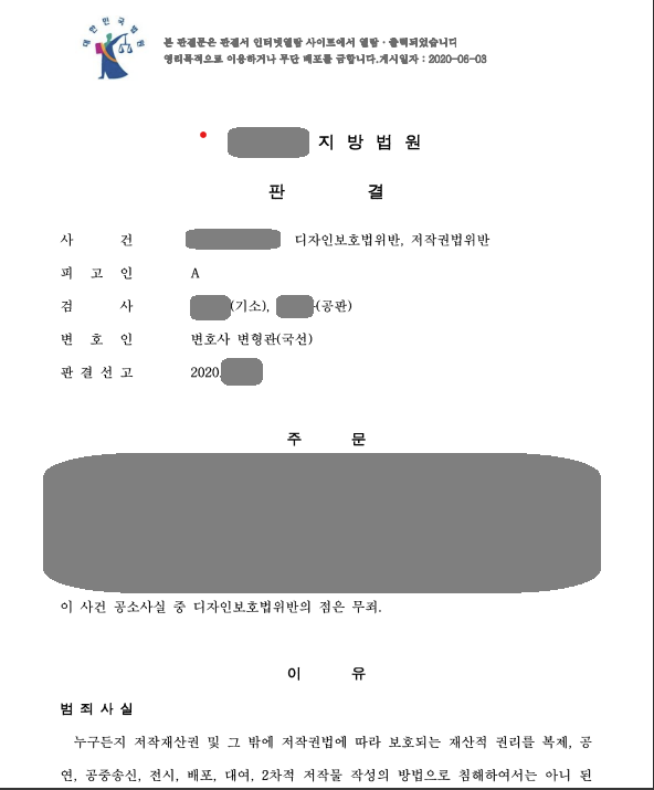 결국 문제가 되었던 디자인보호법에 있어서는 무죄가 선고되었습니다. 공소사실 중 인정하였던 부분에 대해서는 약소한 벌금형이 선고되었지만, 피고인으로서는 억울함을 호소하였던 부분에서 무죄의 판결을 받게 되어 기쁜 마음으로 마무리 되었던 사건이었습니다.